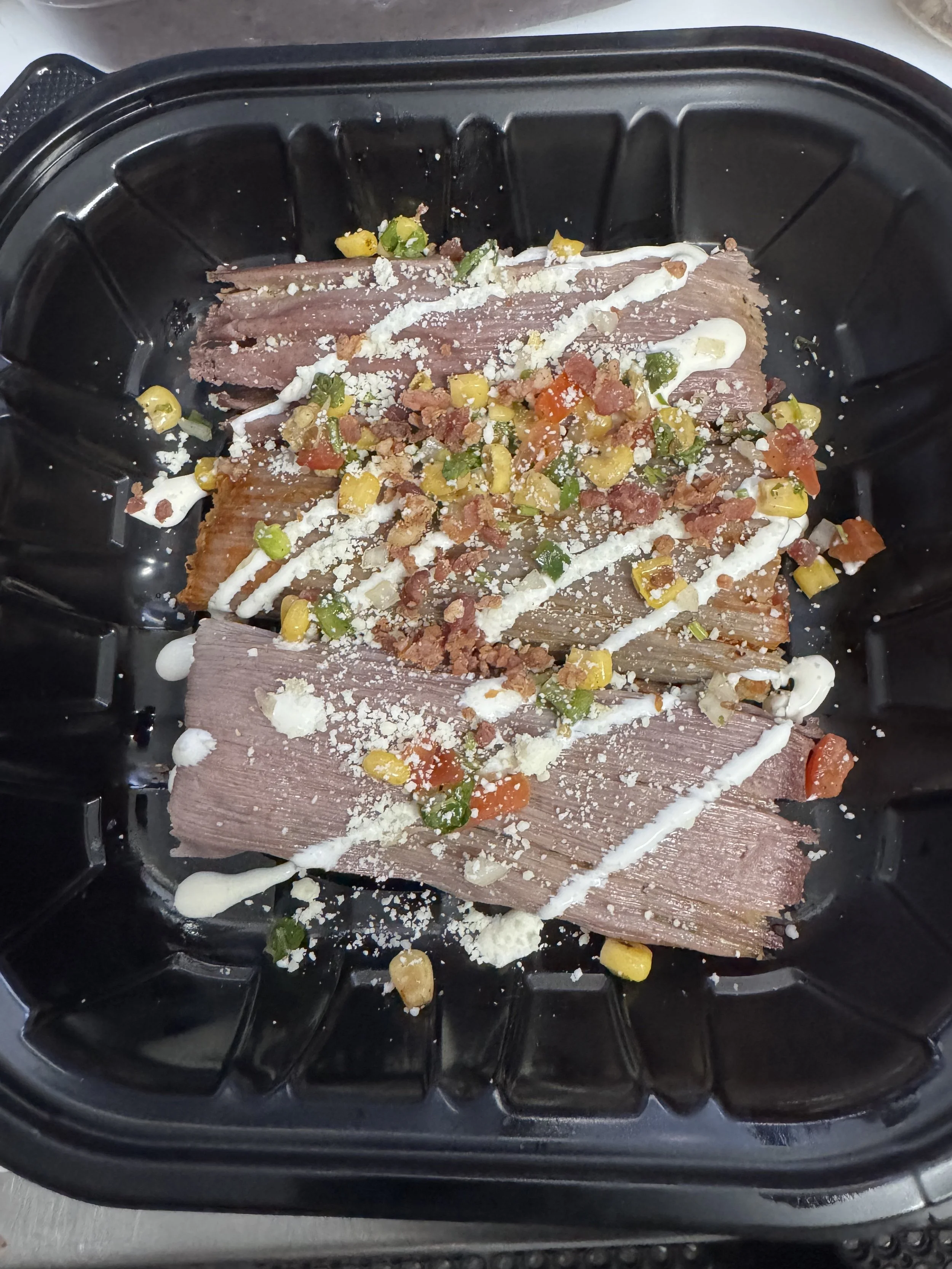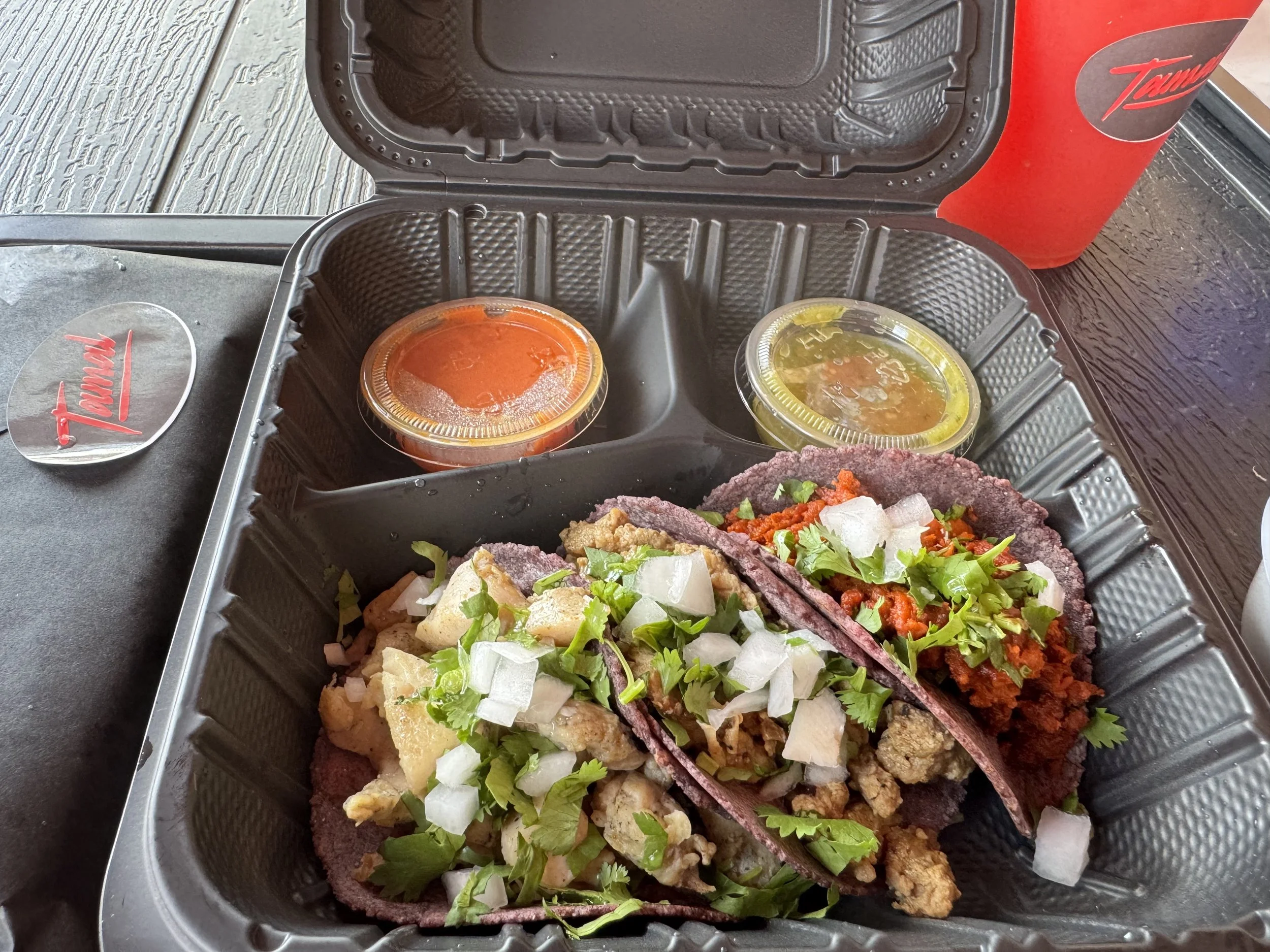“First of all, these are the best Tamales I’ve had since my grandma stopped cooking. These are so well seasoned and the sauces compliment the food so well. The give you a nice punch of heat with a dazzle of flavor to enhance the tamales. The outdoor seating area is nice with really good music. Service was very pleasant and quick. Overall I recommend this place 100% especially if they keep making good food.”